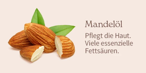 Mandelöl (Prunus Amygdalus Dulcis Oil): Verfügt über einen hohen Anteil an essenziellen Fettsäuren. Es pflegt die Haut und unterstützt die natürliche Regulierung der Hautfeuchtigkeit.